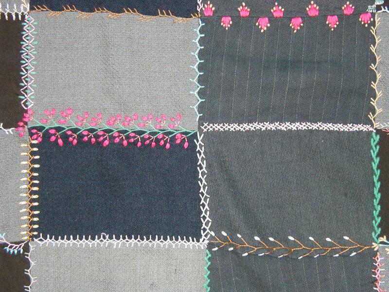 This crazy quilt was made Oct 5, 1895 from denim, cottons, old